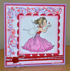 I used FBD's Candy Corn Girl rubber stamp. I colored the candy corn pink, red for Valentine's Day and covered the spider on her hair with a rhinestone. I used Purple Cows, CraftGeek Pin It to attach the joined hearts embellishment.