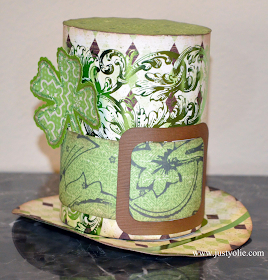 I used Uncle Sam's hat (treat box) from SVG Cuts' "Made In the USA" collection. I did make the brim of the hat slightly larger to allow it to curve. The scallop shamrock is a freebie, also by SVG Cuts. I created the buckle with the basic shapes found in SCAL2.