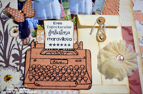 I used the Familia II to stamp "felicidades ahijada" = congratulations god-daughter on the cotton ribbon. The Bitty button {translation: sky's the limit} is from the Voy a ti pack. The clouds are from the Un viaje inolvidable = unforgettable vacation, also by Latina Crafter.