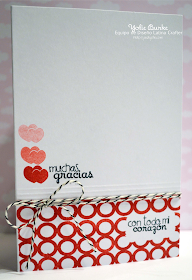 Latina Crafter's stamp of the week is Muchas gracias.  I also used the circle background stamp from Hexágonos y Círculos and the hearts from Aquí crece el amor.  You can barely see it but I did three score lines to qualify for the CAS challenge.  Please stop by the LC blog and check out my DT sisters' projects.