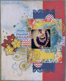 It can be done! I challenged myself to create a layout using only 6x6 paper and I did it. All paper used by Glitz's Yours Truly collection. I covered the horizontal center seam with the chevron border and flowers.I sprayed my background with glimmer mist, forgot I had them. I stamped the swirls using Latina Crafter's newly released stamp.