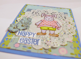 6. This is such a precious card! I just love this bunny and the colors you worked with! Her polka dotted pink top and green pants are adorable!
